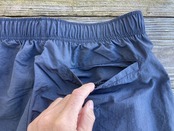 ウエストは丸紐で調整可能。フロント両サイドとヒップの右側にポケットがあります。